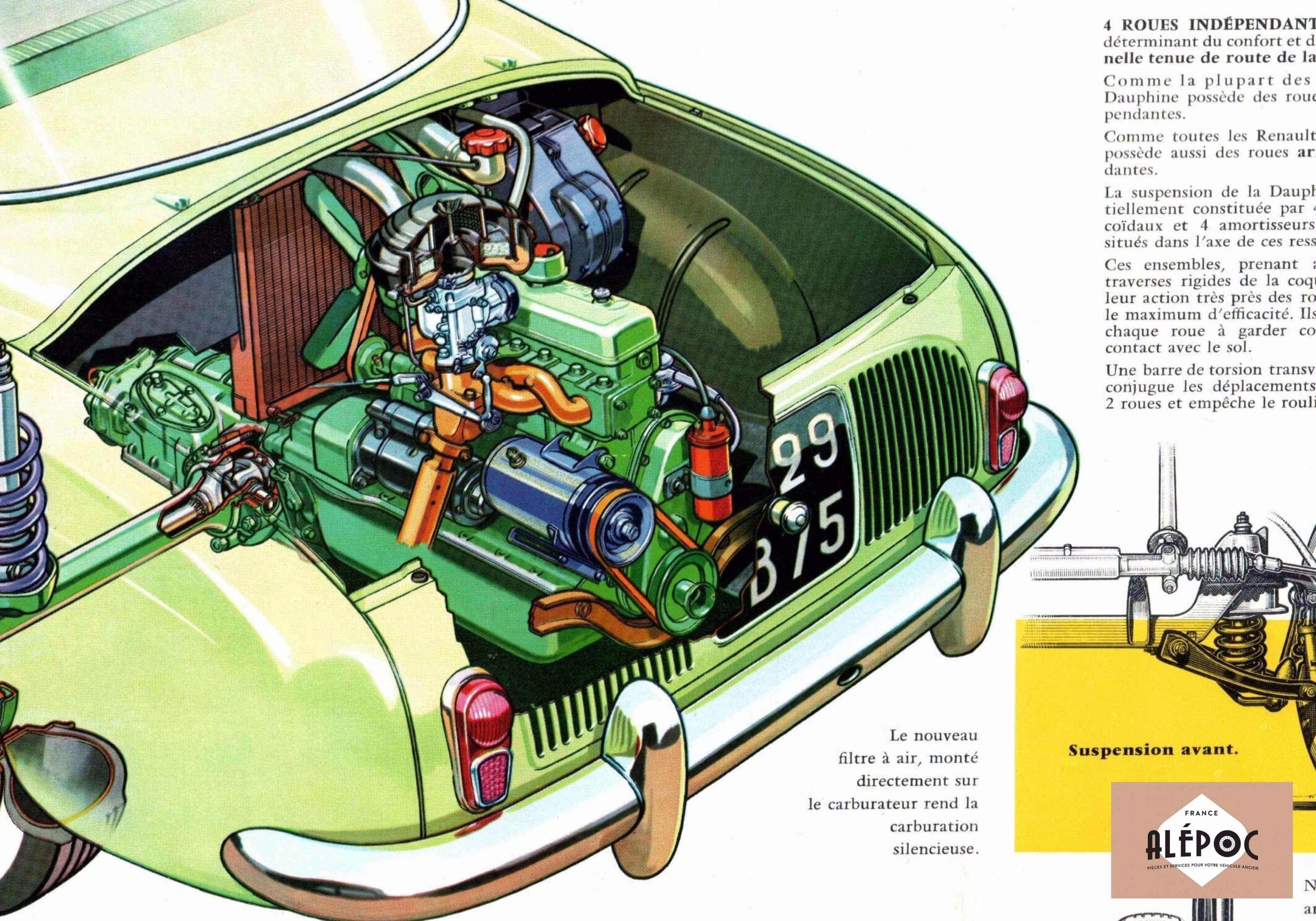 La Dauphine repose sur une caisse autoporteuse en tôle d’acier aux ailes boulonnées, une suspension à quatre roues indépendantes avec ressorts hélicoïdaux, des amortisseurs hydrauliques télescopiques et un moteur Ventoux 845 cm³ de 26 ch à 4 200 tr/mn. Simple, solide, économique il s’entretient facilement grâce aux nombreuses pièces détachées disponibles sur notre site.